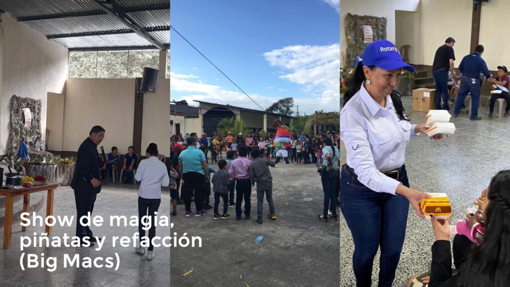 En Club Rotary Guatemala Metrópoli, no solo nos enfocamos en brindar ayuda esencial, sino también en llevar alegría y esperanza a nuestras comunidades. Este fin de semana, organizamos un evento especial lleno de magia, piñatas y deliciosas refacciones, incluyendo Big Macs para todos los asistentes. Fue un día lleno de risas, asombro y felicidad, especialmente para los más pequeños. Este evento no solo sirvió como una pausa divertida en la vida cotidiana, sino que también reforzó el sentido de comunidad y pertenencia entre los participantes. Gracias a todos los que contribuyeron para hacer de este día un gran éxito.